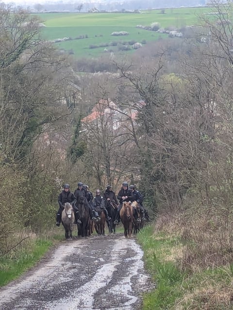 - Première balade entre Sierck lès Bains et Rodemack. Pour cette première sortie de l’année, les 18 cavaliers sont heureux de se retrouver, et aussi de revoir les chevaux de chacun. Nous cheminons le long des boucles de la Moselle, puis poursuivons dans la belle campagne sur des chemins nous permettant de tölter. La pluie s’invite mais surle temps du déjeuner, concocté par Marie-Laure, ce qui nous permet un retour au sec.